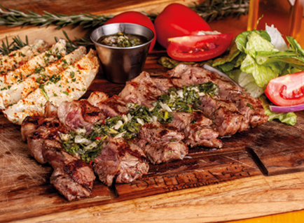 Delicioso corte sudamericano, horneado al carbón y terminado a laparrilla, fileteado y presentado con chimichurri casero. Acompañadode papas gajo y ensalada argentina. (330 grs.). $389