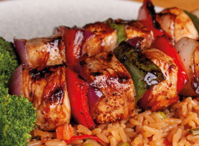 Deliciosa brocheta pechuga de pollo con pimientos, cebollamorada y champiñones, cocinada con nuestra sweet teriyaki glaze,montado sobre una cama de arroz y acompañado de brócoli al vapor.(240 grs.).